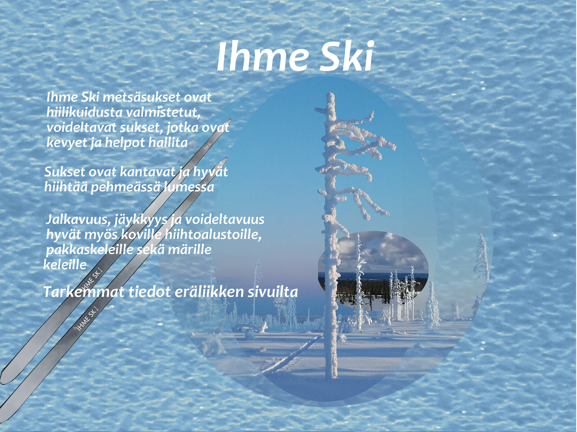Ihme Ski metsäsukset ovat hiilikuidusta valmistetut, kevyet ja helpot hallita. Ne kantavat ja ovat hyvät hiihtää pehmeässä lumessa.
